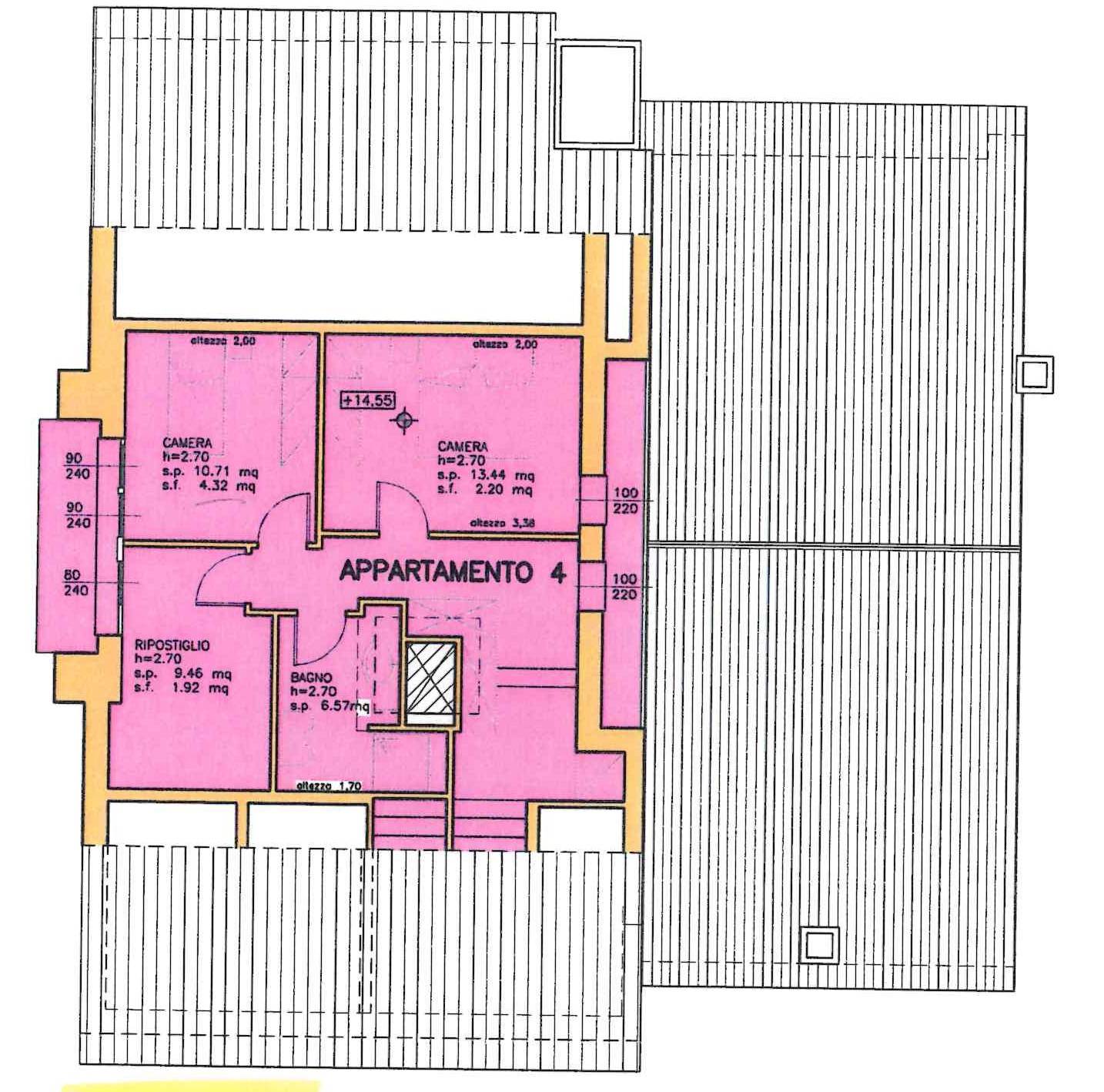 L'appartamento è composto da: piano secondo di circa 100 mq con ampio ingresso soggiorno con splendido terrazzo di circa 14 mq, cucina abitabile, disimpegno, n. 2 bagni, n. 2 camere di cui una matrimoniale, vano scale che ci accompagna al superattico dove troviamo due camere un bagno, una cabina armadio e due terrazzi.