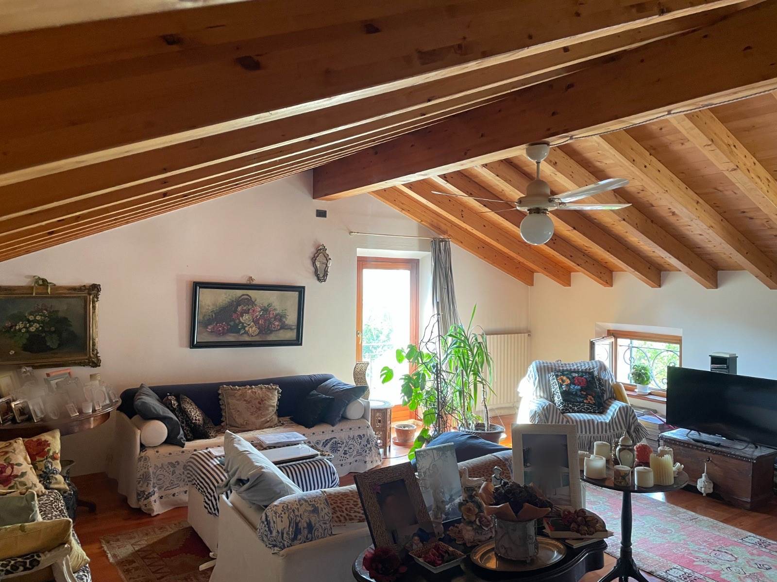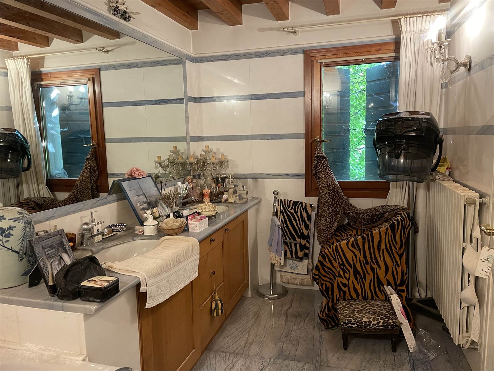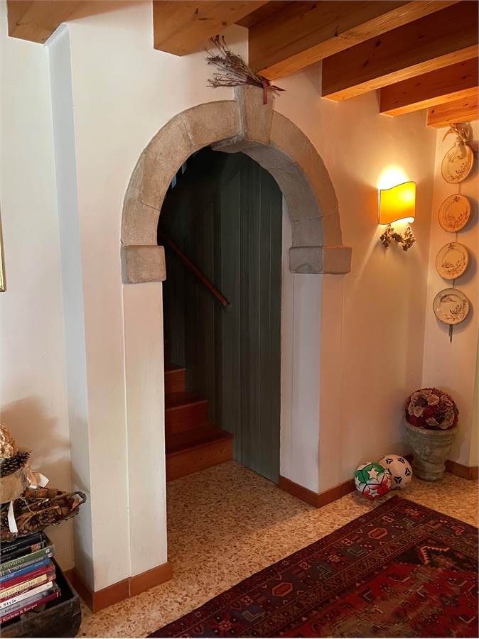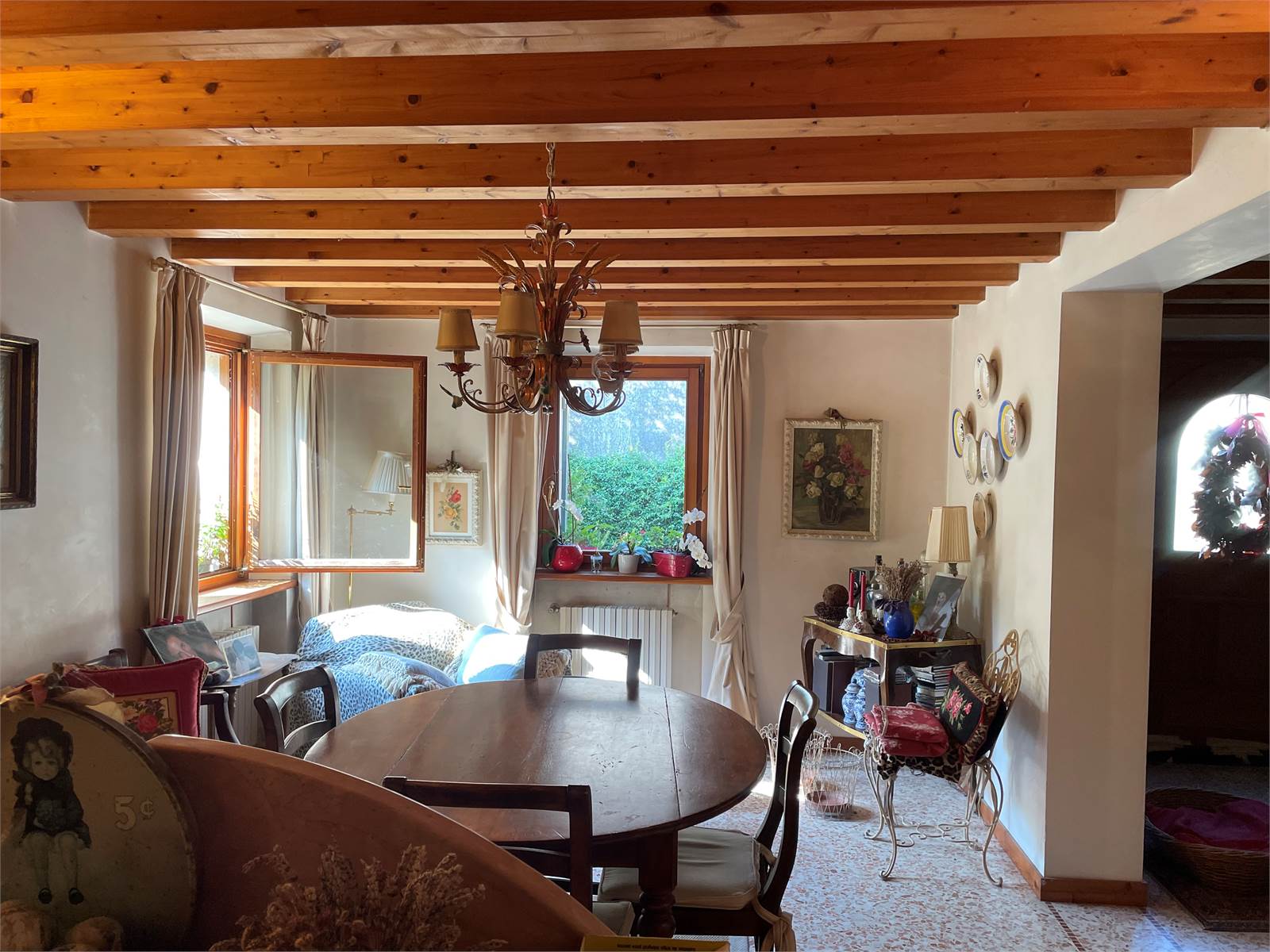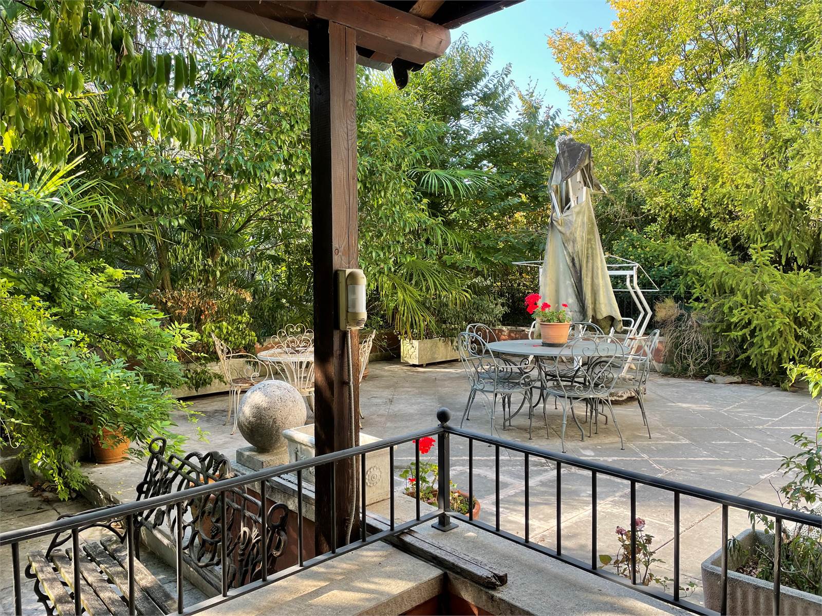 Ingresso diretto in zona giorno composta da grande cucina abitabile, studio, bagno con splendide finiture e disimpegno con uscita su giardino. Il piano terra non offre un vero e proprio salotto, a meno di non cambiarne la struttura trasformando lo studio in cucina. Piano primo di tre camere di cui una singola e sala da bagno sempre con finiture di rilievo. Al piano secondo una grande mansarda utilizzata come salone e una camera da letto. Ripostiglio con zona caldaia, un secondo ripostiglio sottoscala. Nell'interrato invece grande garage pari a 48 mq con accesso diretto all'abitazione. In garage c'è anche zona lavanderia. Esternamente si ha una zona pavimentata pari all'ampiezza del garage, come una grande terrazza, davvero molto bella e privata e poi il giardino, che misura circa 1300mq, in parte pianeggiante in parte in leggero declivio, ma che al momento presenta una sicura situazione di incolto. Le piante sono molto accresciute e tendono ad adombrare la casa su un lato. La massima manutenzione da operare verte appunto sulla gestione del giardino, per cui comunque esiste già un preventivo per l'intervento sul verde. Poche altre manutenzioni sono auspicabili, ma non necessarie. Le finiture sono eccellenti: pavimenti con terrazzo alla veneziana, elementi lapidei, ad esempio il granito rosa e poi il meraviglioso azzurro dei bagni e per gli esterni pavimenti in lastre di pietra rosa; pavimenti in legno di larice resistente ed indistruttibile per la scala e i piani superiori; ferro per le inferriate e gli elementi come cornici e corrimano. Le finiture sono indiscutibilmente sobrie, di alta qualità ed eleganti. Caldaia a condensazione sostituita nel 2018.